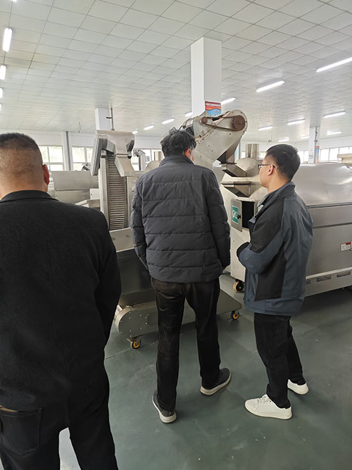 河南信陽(yáng)客戶來(lái)許昌智工試機(jī)4米流水線炒瓜子